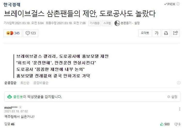 그러면서 "음주운전, 난폭운전, 위험운전, 보복운전 등으로 국민 및 도로 이용자들의 생명 및 재산상 피해가 발생하고 있는 상황에서 브레이브걸스의 홍보는 운전자들의 인식개선 및 위험의 사전제거에 기여할 것"이라는 주장이 함께 들어있었습니다. 브레이브걸스의 노래 가사에 착안한 깔끔하고 논리적인 제안서에 많은 사람들이 공감의 뜻을 표하기도 했는데요.