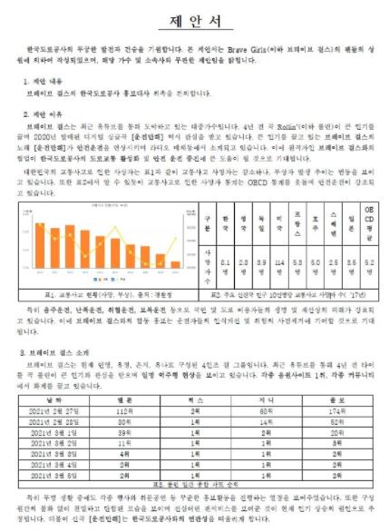 당시 브레이브걸스 갤러리에는 '브레이브걸스의 한국도로공사 홍보대사 위촉을 건의합니다'라는 제목의 글이 올라왔습니다. 첨부된 제안서에는 브레이브걸스의 위상과 운전자들의 안전운전에 도움을 줄 수 있다는 내용이 구체적으로 작성돼 있었습니다.