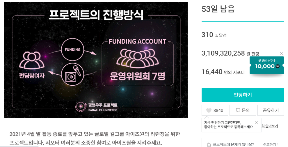 29일 현재까지 모금액은 벌써 30억원을 돌파했는데요. 아직 모금 기간이 54일이나 남은 만큼, 펀딩 금액은 더 늘어날 것으로 보입니다. 평행우주 프로젝트 운영위원회는 4월 27일, 각 멤버들의 소속사에 제안서를 발송했으며, 아이즈원 리런칭에 성공하면 소속사 측에 모금액을 전달할 예정입니다.