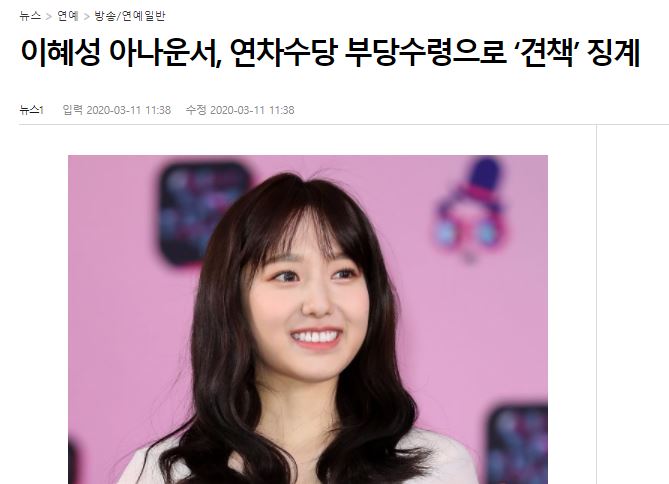 두 번째로, 이혜성은 KBS 아나운서들의 연차수당 부당 수령 건에도 휘말렸습니다. 2019년 모 국회의원이 KBS 아나운서들의 의혹을 제기했습니다. 일부 아나운서들이 거짓으로 휴가 일지를 작성해 1인당 1천만 원가량의 연차 수당을 부당 수령했다는 주장이었습니다. 그러자 KBS는 관련 휴가 내용들을 100% 정정하고 추가 지급 수당을 환수 조치했다고 해명했는데요. 당시 KBS의 대처가 매우 느렸고, 일부러 해당 아나운서들을 감싸주기 위해 징계위원회에 회부하지 않았다는 의혹이 또다시 터져 나왔습니다.