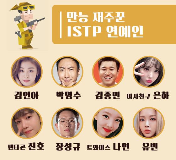 ISTP 연예인 : 김연아, 박명수, 김종민, 은하(여자친구), 진호(펜타곤), 장성규, 나연(트와이스), 유빈, 홍진경, 올리비아 혜, 한(스키즈), 김지훈(크나큰), 환웅 등