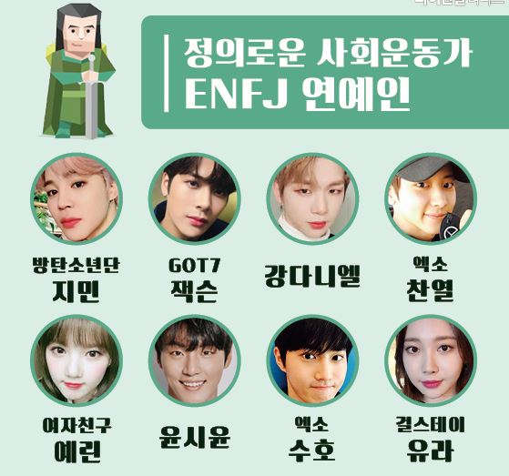 ENFJ 연예인 : 지민(방탄소년단), 잭슨(GOT7), 강다니엘, 찬열(엑소), 수호(엑소), 예린(여자친구), 윤시윤, 유라(걸스데이), 민혁(몬스타엑스), 성진, 송윤형, 유리(소녀시대), 프니엘, BX, 용희, 범규, 조슈아, 민규(세븐틴), 디노, 김재환, 방찬, 윤시윤, 이진혁, 켄타, 루아, 리아, 유나(ITZY), 강다니엘, 이채연, 인성(SF9), 박서함, 재현(N.Flying), 윤호(ATEEZ), RAVN, 이진솔, 찬열, 켄, 현재(더보이즈), 에릭(더보이즈), 이의웅, 박미선, 유주, 우기, 민니, Jun.K, 은서(우주소녀), 김동빈, 왕이런, 김재중, 이찬원, 용승, 비범, 임시완, 류승룡, 수현(유키스), 이상민, 승희(오마이걸), 유라, 니키 등